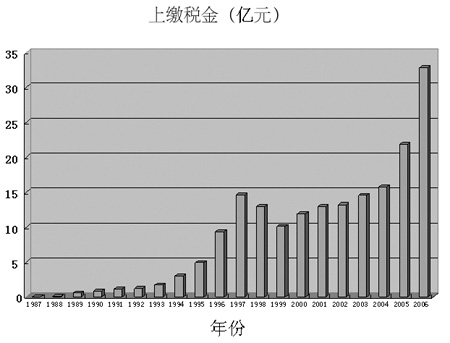 2006年,據不完全統計,全國財務公司上繳稅金33億元,較1987年的50萬元增長了6600倍。(見圖四)