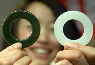 | 工作人員展示將作為2008年奧運會獎牌所用玉料的樣品(左為青玉、右為白玉)。本報資料照片 | 美玉收藏行情看漲