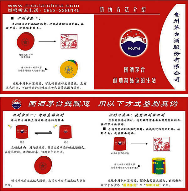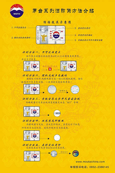據悉,從2009年起,貴州茅臺酒、茅臺王子酒、茅臺迎賓酒將全部采用新的先進的防偽包裝,此舉將從包裝源頭上堵死不法分子利用回收舊包裝物造假賣假的渠道,維護廣大消費者的正當權益。 此次貴州茅臺酒采用的包裝技術和包裝材料,與以往采用的防偽技術和材料相比較,既全面提高了防偽的科技含量等級,又便于消費者在購買茅臺酒時自行鑒別。貴州茅臺酒采用的防偽包裝,被稱之為“3+2+1防偽膠帽”,具有三項“二線防偽”、兩項“一線防偽”和一項“特服密碼”的高科技技術,是集我國多位資深專家之智研究開發的科技成果。其防偽技術均為世界領先水平,曾經獲得國家認證的專利技術20余項,并先后得到國家及省部級頒發的獎勵達34個。此項防偽技術,目前在中國酒類行業內,僅為國酒茅臺享用。 今后,消費者在購買茅臺酒時,只要手持酒瓶對膠帽的頂蓋及側面進行肉眼察看,就可以看到膠帽的色彩與標簽在不同角度下所產生的微妙變化,并憑借自身的視覺能力鑒別出產品的真偽。具體識別方法是—— 膠帽整體:外觀為亞光磨砂紅色,并能在光強條件下產生明顯的珠光效果。 側面部位:在順光方向,“國酒茅臺”四字和廠徽(LOGO)圖案為明亮的珠光增強色;而在逆光方向,該圖文的色彩就顯得相對很淡。 頂蓋部位:從垂直方向看,膠帽頂蓋中央即呈現出一個亞光紅色齒輪圓型圖案,在圖形中央有亞光紅色燙金五星圖案。 消費者若使用防偽識別器進行識別,則可手持防偽識別器貼近眼部,按動開關后即能夠觀察到膠帽上的“國酒茅臺”四字和廠徽(LOGO)圖案及色彩消失,出現彩虹狀背景和黃色“國酒茅臺”及“MOUTAI”文字;從垂直方向觀看膠帽頂蓋部位,可見套帽頂部呈亮黃色,上有黑色浮點可隨套帽的轉動在亮黃色背景范圍內漂移。 茅臺酒此次啟用的防假防偽包裝,其高科技含量集中地體現在酒瓶的防偽膠帽上,凸顯了一種“人無我有,人有我精”的人性化設計、差異化優勢、一體化功能、防偽防剪防回收的獨特功能。 所謂“人性化設計”,是指消費者開瓶時不用再像以往那樣費力地去撕脫瓶蓋膠帽,而只需要像撕開煙盒塑膜封裝一樣,輕輕地一扯,即可卸除密封于酒瓶蓋上的膠帽,并同時撕破防偽標簽。 “差異化優勢”是指,現今在中國酒類企業中“貴州茅臺”采用此種具有領先性的防假防偽技術,這就為國酒茅臺打擊假冒侵權不法行為的工作提供了高科技支撐。 “一體化功能”是指,茅臺酒的包裝膠帽一經套上瓶口,即與酒瓶天衣無縫地融合為一體,開瓶便一次性毀壞膠帽,無從復原。 “三防功能”是指,因防偽、防剪和防回收而采取的特殊制造技術,使那些企圖剪取茅臺酒防偽商標、回收舊酒瓶的造假者失去了制假的條件。 而茅臺王子酒和茅臺迎賓酒則首次采用具有高科技含量的防偽包裝,這是基于已對這兩款茅臺系列產品實施全面提質升級換代之后采取的體現國酒茅臺“顧客價值”創新的一個重要舉措。 據悉,茅臺王子酒、茅臺迎賓酒其防偽標簽有五個特征。這就是:(1)“不可逆溫變點”識別——四個角上的圓點在加熱到60度后,以上圖案呈黑色,并且不可恢復。(2)“隨機光刻多色數碼”識別——標簽酒樽處刮開后用肉眼觀察,即見一組16位隨機數碼,每位數碼內可見多色彩條(使用放大鏡觀察,效果更佳)。(3)“專版全息文字開天窗安全線”識別——肉眼可看見安全線內呈現激光全息“MT”字樣。(4)“雙色熒光纖維絲”識別——在熒光燈下肉眼可見,紅色纖維絲變為亮紅色,藍色纖維絲變為亮藍色。(5)“真彩定位燙印”識別——變換角度后可見茅臺“LOCO”為真彩色。 面對當今國內白酒市場存在的假冒侵權不法行為,國酒茅臺不惜重金投入開發、采用具有國際先進科技水平的防偽包裝,無疑是充分體現科學發展觀、體現以人為本、視消費者為上帝、維護消費者權益的一個重要舉措。