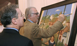 10月27日,在哥倫比亞首都波哥大的總統府,哥倫比亞總統烏里韋(左)看著藝術家博特羅完成作品。這幅由烏里韋與博特羅共同完成的畫作將被拍賣,所得款項將捐給哥倫比亞受傷的士兵和警察。