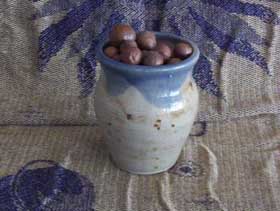 這樣的小罐子,用來插花,挺好,是那種開得密密的、小小的黃白花,放在窗臺上,白色的窗簾再一飄,哈,那是一個很美麗的意境呢;用來裝東西也不錯,我現在裝了一罐子揀來的野栗子,那顏色和這個罐子配起來還挺協調的呢。