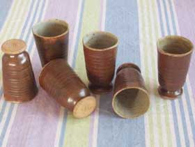 那天,我又逛到了那個基督教二手店,一下子就在一堆器皿中發現了幾個樣式奇特的小杯子。它們的外表是深褐色的,有很明顯的一圈一圈的紋路,拿在手上感覺一點也不滑手。杯子的里面是雞蛋清色,還有麻麻點點的點綴。最有特點的是它們的形狀和底座,瘦長條型的,和一般的西洋杯子的形狀不一樣。尤其是底座,有特意加強的效果,使杯子的重心下移,雖然細長但很穩當。這樣纖細修長的杯子顯然是東方風格的,只有東方人的縝密才能構思出這樣的粗中有細的作品來。在每個杯子的底座下,還有一個方形的印章,看不清是什么字,但很顯然,它們曾經是作者的珍愛。