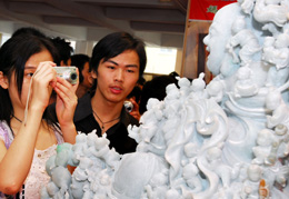 11月19日,為期三天的2006中國(四會)翡翠博覽會在“中國玉器之鄉”——廣東省四會市閉幕。該博覽會吸引了來自東南亞、歐美、中國港澳臺地區的3000多家客商參會。博覽會還舉辦了翡翠玉器展銷和拍賣、玉器精品評選和玉飾品高峰論壇等活動。圖為展會現場一尊價值逾千萬元的玉器工藝品。