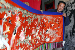 云南昆明74歲高齡的民間刺繡收藏家張龍元先生收藏滇南清代、民國刺繡50余年,繡品累計已達2100多件,并建立起自己的“刺繡博物館”。圖為張龍元老人在他的“刺繡博物館”里展示他收藏的大貢桌圍百鳥朝鳳。