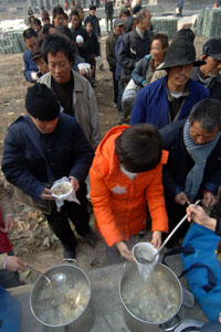 12月10日,一些流浪者在領取食物。 陜西省西安市有一支專門為流浪者提供衣食的志愿者隊伍,被人們親切地稱為“慈善廚房”。志愿者隊伍由英國人托尼發起并出資,人員大多為在互聯網上招募的大學生和西安市民。每個周三的晚上和周日的中午,這些志愿者先在固定地點為流浪者分發食物和衣服,然后深入到西安鐘樓附近的鬧市區主動尋找流浪者,為他們提供衣服,用愛心向流浪者傳達一種互相幫助的理念。到目前為止,“慈善廚房”活動開展已近一年,共有237人輪流參加志愿活動,受到他們幫助的流浪者達4000人次。
