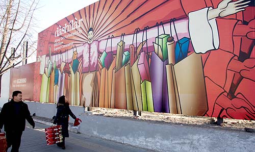 一批富有老北京韻味的商業風情畫日前出現在北京前門大柵欄商業區改造工地的圍擋上,吸引了過往行人的眼球。