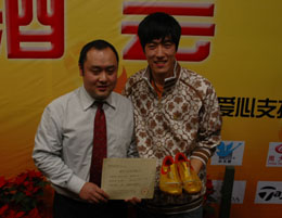 1月21日,劉翔親手把跑鞋交給買家。中國體育明星慈善拍賣酒會21晚上在江蘇省無錫市舉行。其中,一雙劉翔使用過并親筆簽名的金色跑鞋,被一位買家以15萬元的天價購得。本次拍賣會共拍得44.6萬元,將全部用于運動員和教練員的保障工作。