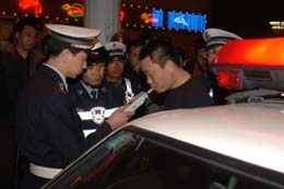 邯鄲市近日開展夜間專項整治,治理酒后駕駛、無牌無證等交通違法行為,打造平安暢通交通環境。圖為邯鄲市交警利用酒精測試儀治理酒后駕車。