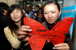 近來,在銀川市部分招聘洽談會上,一種制作成蝴蝶形狀的招聘廣告單十分引人注目,據說在職場中“紅蝴蝶”能給求職者帶來好運。圖為招聘洽談會上一名女孩正在展示“紅蝴蝶”招聘廣告單。