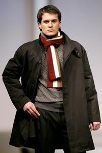 “世界風”在意大利設計界的風靡使得本季秋冬男裝中融合了多國元素:極具英倫特質的方格圍巾,襯托出男性優雅的面孔;大翻領雙排扣的古典韻味的風衣配以高領針織衫,盡顯男性的智慧和優雅;大口袋的西部特色的短款上衣配以休閑長褲,使得男性在成熟中略帶一點慵懶。 男裝的面料也呈現多元化和大膽化。精致的精紡羊毛面料套裝,修身剪裁,合體精練。而經典的格子面料也不可或缺,加上挺括的精紡羊絨,色澤柔和手感柔軟的山羊皮的運用,更提升服裝的價值感。更有大膽者將絲絨面料大幅用來做西服上裝,給人以新鮮的沖擊感。另外,不同材質和顏色的大面積的拼接和混搭也是本季的一大亮點。