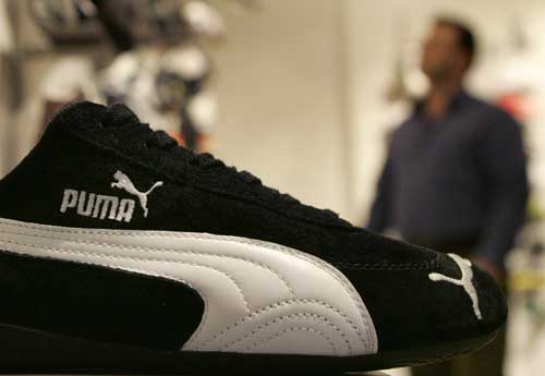4月10日,一名男子在德國黑措根奧拉赫的彪馬專賣店內選購鞋子。法國皮諾-春天-雷都集團(PPR)10日宣布,集團已購買彪馬公司27.1%的股權,它還計劃善意收購彪馬的剩余股份。
