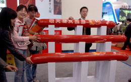 4月27日,幾位參觀者在好奇的觀看幾根超大火腿腸。正在河南鄭州舉辦的第二屆中國中部投資貿易博覽會上,一家食品加工企業特別制作了三根各重50公斤、長兩米的超級火腿腸在現場展示,吸引參觀者。
