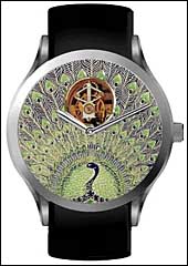 梵克雅寶腕表上的孔雀圖案最初出現于其1950年的百寶匣系列,表盤上的圖案是以特別的搪瓷技巧將孔雀的最美麗一面展現人前。工匠首先在金版上雕刻孔雀圖案的外形,再將其他空位挖空,造出圖案的輪廓。跟著,以搪瓷填滿被挖空的空位。一只色彩繽紛、栩栩如生的孔雀便活現于表盤上。