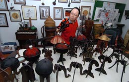 被稱為津門“帽子王”的王德強癡迷收藏古代冠架10多年,目前他收藏的明清兩代折疊式和壁式冠架達到200余架。據介紹,古人稱帽子為冠,大多為男人所用,冠也是男人尊嚴的象征不能隨便擺放。冠架一般是被放置在正廳的香案上的,如果來客見冠架上有男主人的帽子即可登門拜訪,如不見帽子即不方便做客,是人們日常生活中不可缺少的家具。圖為王德強在展示收藏的部分明清兩代折疊式冠架。