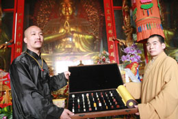 著名金石篆刻家黑石(左)把采用五十三方芙蓉石、雞血石、田黃石和朱砂等中國著名石材,歷時三年篆刻成的藝術品《舍利心經》捐贈給陜西法門寺。