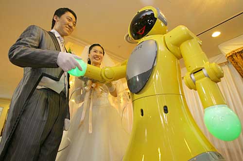 日前,在韓國中部城市大田,新郎錫先生(左,音譯)同自己設計的機器人司儀泰羅握手。在韓國一機器人制造公司擔任設計師的錫先生當天舉行婚禮,“邀請”自己參與設計的機器人泰羅擔任婚禮司儀。據介紹,這是世界上首次由機器人擔當婚禮司儀;槎Y后泰羅將被升級改造,用作他途。泰羅造價約為21.5萬美元。