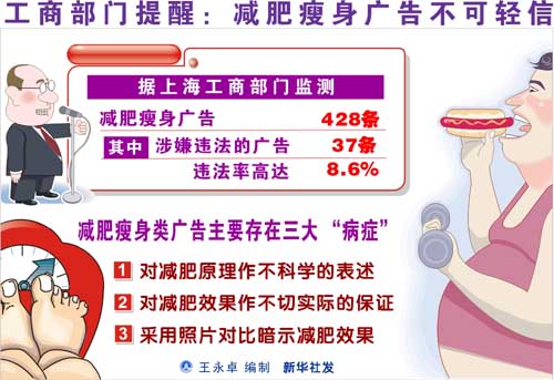 隨著人們健康觀念的日益增強,越來越多的人開始關注肥胖問題。肥胖本身是一種疾病,其危害程度遠高于吸煙,已成為許多非傳染性疾病的主要致病因素。醫學研究證明,肥胖可誘發高血壓、糖尿病、冠心病、中風等疾病,患糖尿病、膽結石、月經異常的幾率也成倍增加。 面對肥胖這一健康的“障礙”,許多人都把減肥列入了日程。如今,翻開報紙、打開電視,各種各樣的減肥廣告撲面而來。但這些效果“喜人”的減肥產品、非!罢帯钡臏p肥中心,真的能讓你成功減肥并且有助于健康嗎? 在哈爾濱市的一些媒體上,經常出現快樂減肥基地、專業減肥中心等機構打出的廣告,稱“42天/期減30至80斤”、“鄭重承諾一個月減20斤、兩個月減40斤”、“八分鐘瘦身,一療程減15至30斤,少減一斤全額退款”、“三餐照吃,達不到承諾少一斤退100元”等,讓消費者對減肥信心倍增,仿佛短期內就可重現苗條身材。 但監測顯示,減肥瘦身類廣告已成為虛假、夸大宣傳的重災區。上海市工商部門近期監測了各類減肥瘦身廣告428條,其中涉嫌違法的廣告有37條,違法率高達8.6%,遠遠高于全市廣告平均違法率。工商部門表示,減肥瘦身類廣告主要存在三大“病癥”:對減肥原理作不科學的表述,對減肥效果作不切實際的保證,采用照片對比暗示減肥效果。 哈爾濱醫科大學附屬第一醫院營養科主任閆雅更教授說,正常減肥應是以每月體重下降0.5至0.75公斤的速度持續,一年才能減掉六至九公斤,目前許多減肥廣告在效果宣傳上都有些過度。而減肥瘦身類產品、服務的價格往往較高,虛假廣告宣傳會對消費者的健康和經濟造成雙重損害。