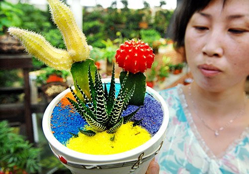 一位女士正在觀看一款鋪墊著彩砂的盆栽。近日,銀川花市上出現了一種鋪墊著彩色砂土和石子的盆栽植物,艷麗的彩色砂石為原本單調的綠色觀葉植物增添了別樣色彩。