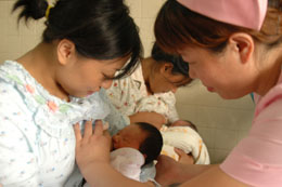 8月3日,護理人員在教一名年輕媽媽正確的母乳喂養姿勢。 每年8月的第一周是“世界母乳喂養周”,今年的主題是“母乳哺喂——第一個小時拯救100萬個嬰兒”。湖北省襄樊市第一人民醫院產科醫護人員走進母嬰病房,開設母乳喂養宣教小課堂,為年輕孕婦和產婦普及母乳喂養科學知識。新華社發(龔波