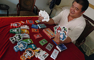 “這些撲克都是我從牙縫里省出來的,心愛得就像自己的孩子”趙玉學說。 1987年,趙玉學剛到陽泉鋁業公司上班,跑采購的他“幾乎天天出差”。在外地忙完工作,趙玉學經常買副撲克作為紀念,他說是因為“買不起別的紀念品”。隨著撲克增多,上世紀90年代初,趙玉學開始專業收藏撲克。 在趙玉學的藏品中,有十余個國家的外國撲克。1990年,趙玉學去連云港出差,在一家大超市看到一副日本著名的“浮士繪”撲克。這種反映日本民間藝術的撲克紙質極好,手感光滑如綿,繪圖印刷精美,但一副23元。這樣的價位,令趙玉學在這家超市幾進幾出。最后,愛牌心切的他還是咬牙買了,F在,趙玉學已經收集了五套不同的“浮士繪”撲克。目前,這種國內很少見的撲克每套售價在百元以上。 為了收藏撲克,有著15年煙齡、一天抽三包煙的老煙民趙玉學戒了煙。1992年,為了收集毛主席像剪紙撲克,他一下花掉三個月的工資。 趙玉學的親朋好友知道他有這個愛好,只要出差,總會給他帶回一些外地撲克。趙玉學的不少外國撲克,就是靠這種方法收藏到的。