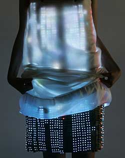 | 在日本首都東京,一名模特展示一條發光的裙子。新華社/路透 | 服裝向來被用來保護人體不受外部環境影響或維持人們的良好形象。然而,在美國加州圣迭戈舉行的2007年計算機圖形學年會“未來服裝展”卻讓人大跌眼鏡。因為未來的服裝不再是傳統意義上的“人體保護層”,而是融合高端技術的智能服裝。 據英國《衛報》報道,智能服裝就是裝有電子配件和微型電腦的服裝,在人們日常生活中能起到輔助作用。有的智能服裝可以給音樂播放器充電,有的可以傳遞秘密信息,有的能發光,還有的可操縱電腦游戲。 美國紐約大學的安德魯·施奈德發明出一款“太陽能比基尼”。這款泳裝上分布了40個可變形光電電池,用來給USB接口充電。如果把shuffle款的iPod插上,僅兩小時就可以完成充電。 埃萊娜·孔切羅也充分利用了太陽能。她發明的服裝配飾如手鐲,裝有太陽能接收面板。這種配飾白天吸收日光,晚上閃閃發光。 美國卡內基-梅隆大學人類與計算機互動研究所主任丹尼爾·斯維瑞克說,以當今的技術水平,要把電源開關和微型電話置入服裝中并不是一件難事,但仍然存在兩類障礙!叭绻(智能服裝)要成為你日常生活中的常規用品,你的衣柜中必須全是這類服裝。其次,它必須可以清洗”。但遺憾的是,如今大多數智能服裝都無法沾水,也經不起清洗劑的“折騰”。 施奈德的“太陽能比基尼”就有這樣的問題。如果穿著者是位游泳愛好者,則必須十分小心,因為“在插上iPod之前,你必須確保你的泳裝保持干爽”。 但這似乎阻擋不了人們對發明智能服裝的熱情。世界著名電子公司飛利浦已經為它發明的一款能根據身材隨意改變尺寸的衣服申請了專利。這種衣服的面料帶有形狀記憶合金,一旦人們穿上,它就會“記住”尺寸。
