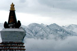 青海湖畔的佛塔與“雪山云!逼嬗^相映成趣。 本報記者:侯德強 攝 |