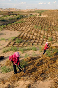 寧夏三面環沙,當地干部群眾依托“三北”防護林等國家重點生態建設工程,長期采取一系列綜合治理措施,有效地遏制了生態惡化趨勢。全區沙化面積凈減少5.3萬公頃,實現了治理速度大于沙化速度的歷史性轉變。圖為寧夏白芨灘自然保護區員工在毛烏素沙地邊緣的沙丘上扎草方格。