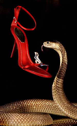 英國哈羅德百貨公司日前發布新款鞋時,為防止價格昂貴的鞋遭竊,竟想出奇招,“雇傭”一條眼鏡蛇為“保鏢”。毒蛇與精致鞋子的搭配,自然成為一大亮點。