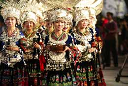 9月15日晚,在第十八屆上海旅游節的序幕上,黔東南苗族侗州自治州的姑娘們以酒為禮獻與觀眾。 本報記者:鄭悅