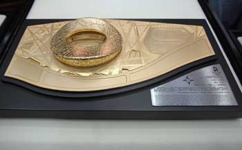 以北京奧運會主體育場——國家體育場為造型的奧運特許商品“鳥巢”金屬模型,9月19日起在北京、上海、廣州、沈陽、青島等12個城市的16家奧運特許商品專賣店同步上市。 據北京奧組委相關人士介紹,“鳥巢”金屬模型是把國家體育場按照標準尺寸等比例縮小。該金屬模型包括了“鳥巢”及周圍地形、水系、訓練場等,將“鳥巢”空間結構和細節——如鋼架結構、入口、臺階、看臺、賽場等的位置和形象非常精準地表達出來。 模型有鍍金和鍍古錫兩種顏色,分為大、中、小三種型號,價格從900多元到4000多元不等,其中大、中兩種型號限量發行。特別具有收藏意義的是,大、中號產品的金屬標牌均由建筑“鳥巢”的剩余鋼材制成。 |