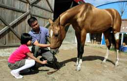 自“十一”黃金周開始,來京東燕郊北京燕龍國際馬業俱樂部的游客又多了個節目——免費觀賞“汗血寶馬”,并通過喂馬、舒洗馬毛、與馬合影等形式與寶馬親密接觸。 這里展出的三匹珍貴的純種汗血寶馬,是我國首次通過民間渠道從土庫曼斯坦引進的。 “汗血寶馬”是經過3000多年培育而成的世界上最古老的馬種之一,目前世界上共有近3000匹,其中2000多匹存于土庫曼斯坦。 我國現在共有五匹“汗血寶馬”,除這三匹外,另兩匹是土庫曼斯坦領導人曾作為國禮贈送給我國領導人的。 汗血馬被土庫曼斯坦奉為國寶,在歷史上大都作為宮廷用馬,其形象繪制在國徽和貨幣上,目前在國際上的售價每匹最高可達千萬美元。據悉,這三匹馬中的一匹將被拍賣,所得錢款部分用于贊助2008年奧運會馬術比賽。圖為八歲小朋友司馬嘉檸和他父親與“汗血馬”零距離接觸。