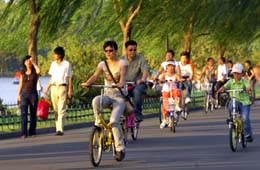 游客騎車游覽杭州西湖白堤景區。不久,游客就可坐黃包車,賞西湖景。本報記者:徐昱