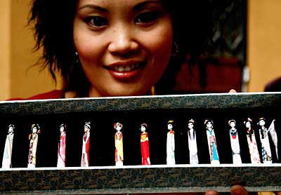 26歲的天津市民李月晴從小就練習在粉筆上雕刻,至今已制作完成中國古代四大美女、紅樓夢人物、卡通人物等多組粉筆雕刻作品。圖為李月晴展示自己制作的粉筆雕刻作品。