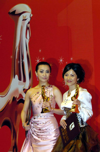 圖為獲得第26屆中國電影金雞獎最佳女主角獎的顏丙燕(右)和劉嘉玲在獲獎后與媒體見面。