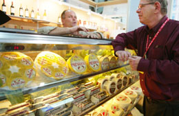 11月14日,外國參展商向觀眾介紹一種進口乳酪。 當日,國內最高規格的西餐餐飲文化交流活動——中國第四屆西餐文化節在上海浦東新國際博覽中心拉開序幕。為期三天的中國西餐文化節將由“FHC國際烹飪藝術比賽”、“國際食品、飲料、酒店、餐飲、烘焙、零售設備博覽會”、“西餐行業發展論壇”、“國際廚藝交流”等多項活動組成。中國西餐文化節是由中國烹飪協會發起與各省市地方政府聯合主辦的國家級中外西餐飲食文化交流盛會,每兩年舉辦一屆。自2001年起,已分別在天津、廣州、北京舉辦了三屆。 |