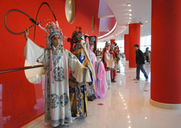 11月23日,從屬于中國京劇院的梅蘭芳大劇院舉行落成開業慶典活動,一尊梅蘭芳銅像安放在梅蘭芳大劇院大廳正中。圖為觀眾在梅蘭芳大劇院的京劇藝術展示大廳內欣賞京劇人物造型。