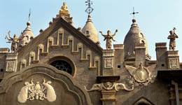 武漢古德寺,是國內漢傳佛教中惟一一座仿緬式佛教寺院,始建于清光緒三年(1887年)。寺院迥異于中國傳統佛教寺廟樣式,仿緬甸阿難陀寺院風格,分別借鑒了南傳佛教“帕那瓦”式的群塔叢林和古希臘神廟的柱廊特征,并融入了哥特式建筑風格。這座融匯大乘、小乘和藏密三大佛教流派于一身,并具有多元化建筑風格的寺廟,是武漢百年前即向世界開放的有力證據,具有非常獨特的建筑觀賞價值、旅游價值與文物保護價值。圖為古德寺圓通寶殿頂部的造像和圖案,具有鮮明的異域佛教寺院風格。 |