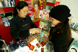 今年43歲的王建萍,夫妻雙方下崗,孩子在上大學,經社區工作人員的幫助,現在打兩份工。圖為王建萍(左)在青海省西寧市的一家化妝品店內為顧客介紹產品。