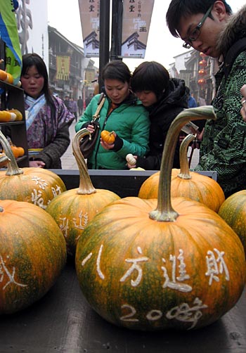 伴隨春節到來,一些刻上了吉祥語句的小南瓜亮相杭州市河坊街。這些既可以食用又可以當作擺設的小南瓜吸引了很多市民購買。
