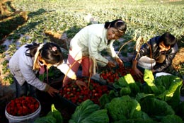 近年來,云南省彌勒縣將發展冬季特色農業作為新農村建設的首要任務,為農民引進優良品種,提供技術指導,在彌陽鎮大莊村建立草莓科技示范基地,使異地草莓在這里扎根并獲得豐收,大大增加了農民收入。圖為彌勒縣彌陽鎮大莊村村民劉菊珍(中)一家在草莓園將采摘的草莓分級整理。