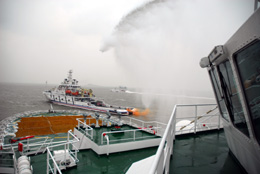 1月23日,“南海救101”輪在救助演習中動用消防水炮,直射假想中的難船。