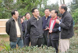 財政部副部長、國務院海南農墾管理體制改革工作小組組長廖曉軍(左二)考察海南農墾(左一為海南農墾總局局長王一新)。楊平昌 攝