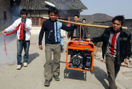 2月12日,貴陽市花溪區水利局的三名工作人員和村民一起,將發電機抬進高坡鄉掌已村。貴陽市花溪區高坡鄉是當地受凝凍災害最大的鄉之一。由于恢復正常供電仍需一段時間,花溪區組織采購60臺汽油發電機,免費送到受災村莊,解決群眾生活用電。