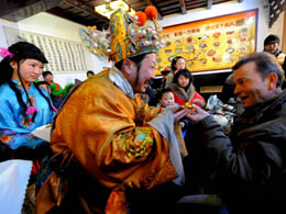 2月14日,是農歷初八,山西平遙古城在春節期間推出“縣太爺拜年”、“財神爺賜!钡忍厣糜伪硌,讓游客在欣賞平遙古城的同時,體驗晉商故里的濃情民俗,感受年文化的魅力,受到游客的歡迎。