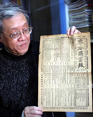 今年68歲的樹仁懷是哈爾濱一家企業的退休干部,從上個世紀70年代開始,樹仁懷開始收集報紙,1995年,他憑借自己的收藏建成了“樹仁懷藏報館”。目前“樹仁懷藏報館”已收集到世界范圍內的13000多種報紙,藏報種類涉及軍事、農業、文化、教育等多種,其中1925年的《游藝畫報》及1929年的《察哈爾黨報》等更是樹仁懷收藏中的珍品。 樹仁懷告訴記者,藏報館建成后,他開始從事健康類信息的剪報工作,并把剪報資源按照疾病種類整理成54個系列的數千種偏方和健康指南。樹仁懷的老伴說,現在打電話或直接到藏報館查閱資料的人很多,老樹都非常熱情地免費為他們服務。 退休在家的樹懷仁老人不抽煙也不喝酒,平時吃飯穿衣都很簡樸,他把和老伴的退休金很多都花在了收集報紙上。樹仁懷住在哈爾濱一個普通的居民小區,全家40平方米的住房一大半都被報紙占滿,他現在每天都要花10多個小時來整理報紙。樹仁懷說:“在收集報紙上面花錢,我一點都不心疼!