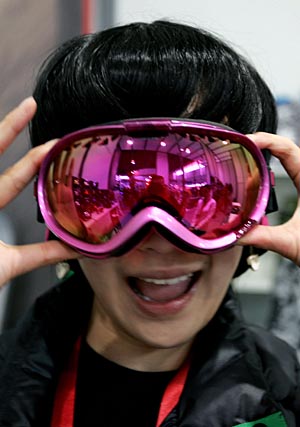 2月24日,第四屆亞洲國際品牌體育用品及運動時尚博覽會在北京中國國際展覽中心開幕。本屆博覽會為期三天,眾多國際品牌體育用品在博覽會上與觀眾見面。圖為一名女孩在博覽會展臺前試戴一款滑雪鏡。
