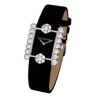梵克雅寶:Fleurette系列腕表 長方形表殼搭配黑色表盤,兩側各鑲有一排美鉆,Fleurette系列經典花朵置于表盤兩端與黑色緞面表帶相連。 |