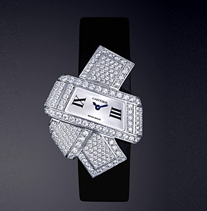 卡地亞:和服版平結腕表 該款腕表以日本和服寬版腰帶為靈感,密鑲璀璨美鉆,搭配深灰色磨面帆布表帶。其中,略帶弧度的圓鉆鑲嵌由小到大依次排列。 |