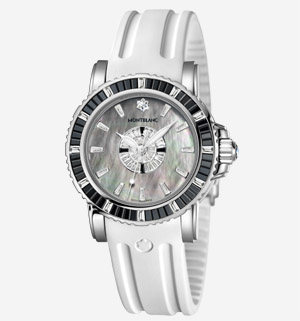 萬寶龍:運動型腕表 萬寶龍為旗下運動型腕表披上了華麗的鉆石外衣:表圈鑲嵌有48顆頂級威塞爾頓階梯形切割鉆石及12顆黑色藍寶石;珍珠貝母表盤的63顆鉆石及4顆黑色藍寶石與夜光指針相呼應;直徑達38毫米的表身,搭配經典萬寶龍星形鉆石。 |
