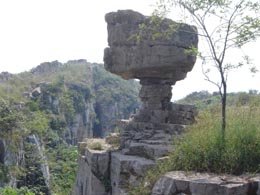 在山東沂蒙山區的蒙陰縣界牌鎮塌崖山頂峰,有一尊“火炬石”,其狀貌與熊熊燃燒的火炬極其相似,讓人不由不驚嘆大自然的鬼斧神工。 這塊奇石位于界牌鎮南3公里處的塌崖山頂峰,遠看像一個正在燃燒的火炬!盎鹁媸鄙隙酥睆郊s2米,根部直徑僅約0.3米。巨石立于一點,看似搖搖欲墜,但多少年了,歷經風霜雪雨的侵蝕而不倒。 據介紹,“火炬石”周邊區域已被當地開發成為集民俗、休閑、娛樂、觀光于一體的綜合性生態旅游區,成為沂蒙山區旅游的一個新亮點。隨著北京奧運會日益臨近,越來越多的游客到“火炬石”旁邊留影。 地處沂蒙山區的臨沂市是遠近知名的“中國奇石之鄉”,特別是這個市的費縣境內,奇石眾多,千姿百態,妙趣橫生。